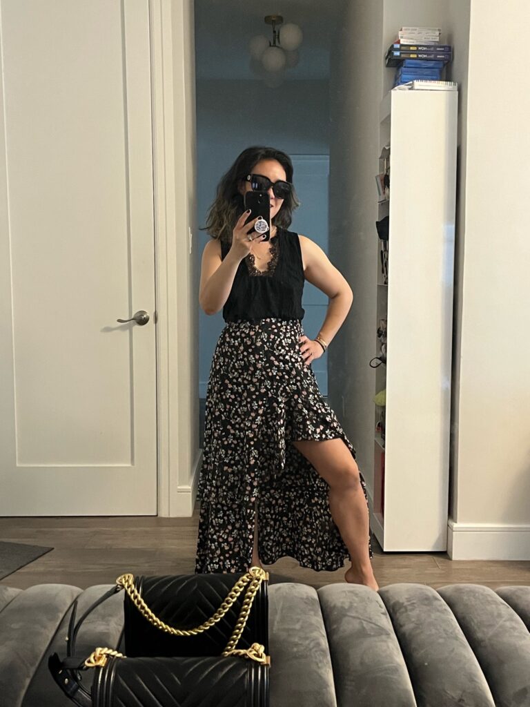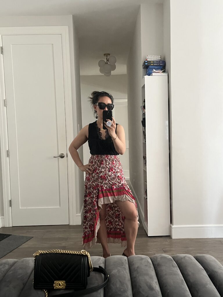 I love this skirt so much I bought it twice. The skirt fabric is a soft woven. I love the ruffle detail on the black floral version. The border print on the red floral version looks expensive. The top is old Ann Taylor LOFT. You never know where you’ll find something good. It’s an old one, but an amazing find. Never turn your nose up to anything. Try EVERYTHING!